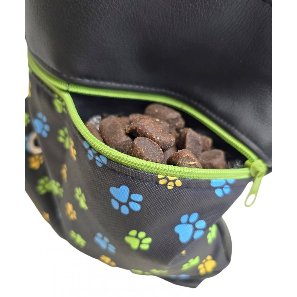 Kabelka disponuje venkovními kapsami o rozměru 13 x 14 cm, z nichž jedna může sloužit na pamlsky a druhá je pro uložení sáčků na psí exkrementy.